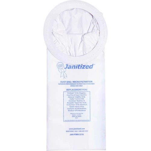 Commercial Grade aftermarket filters designed for commercial cleaning professionals. Our vacuum bags and filters incorporate filter materials that meet or exceed OEM filter specifications and performance. These products are exceptionally tough and durable; built to handle demanding cleaning applications while improving indoor air quality and worker safety by capturing 99% of sub micron dust particles and allergens. Our vacuum bags & filters provide up to 40% more vacuum cleaner suction, up to 55% more dust loading area and up to 46% more wet/dry tear strength vs genuine OEM filter bags. Includes 10 packages per case. Sold in quantities of 100.