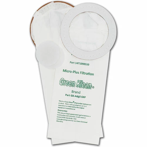 Green Klean® Replacement vacuum bags use the highest quality Micro-Plus filter media including Melt-Blown inner liner in order to achieve filtration efficiencies up to 99.9%. Designed specifically for commercial use, they are always equal to, or exceed OEM quality. Better filtration means cleaner air, less dusting, longer secondary filter life, at considerable savings. Each bag is printed to easily identify the vacuum it fits. Sold in quantities of 100 (10/10 packs).