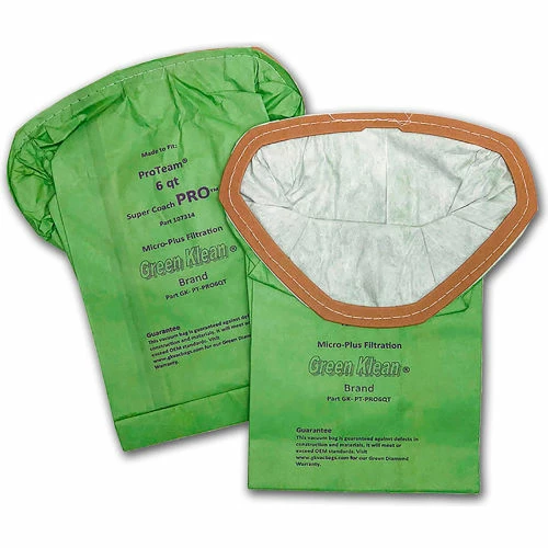 ProTeam Super Coach PRO 6 Qt Replacement Vacuum Bags (10/10 packs per case) Green Klean® Replacement vacuum bags use the highest quality Micro-Plus filter media including Melt-Blown inner liner in order to achieve filtration efficiencies up to 99.9%. Designed specifically for commercial use, they are always equal to, or exceed OEM quality. Better filtration means cleaner air, less dusting, longer secondary filter life, at considerable savings. Each bag is printed to easily identify the vacuum it fits.