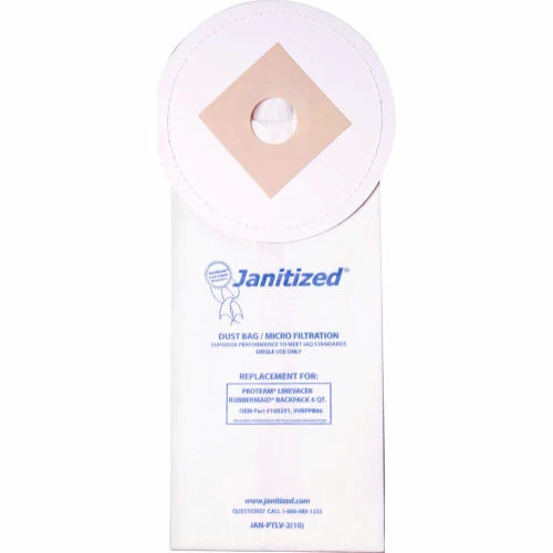 Janitized® vacuum bags and/or filters are designed to meet or exceed OEM standards. ProTeam Replacement Paper Vacuum Bag are made of 2 Ply Paper/Meltblown Micro Filter. For use with ProTeam LineVacer. Sold in quantities of 100. 1 Year Limited Warranty.