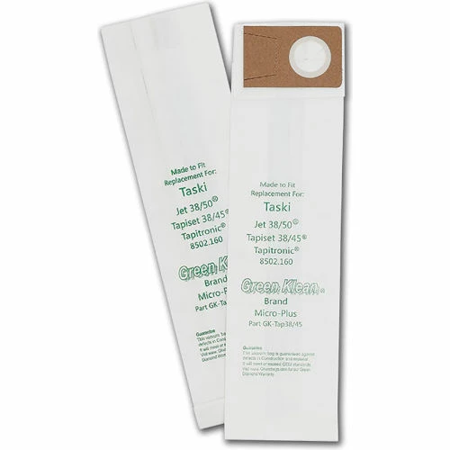 TaskiJet 38/50, Tapiset 38/45, and Tapitronic Replacement Vacuum bags. Green Klean® Replacement vacuum bags use the highest quality Micro-Plus filter media. Designed specifically for commercial use, they are always equal to, or exceed OEM quality. Better filtration means cleaner air, less dusting, longer secondary filter life, at considerable savings. Each bag is printed to easily identify the vacuum it fits. 100 per case.